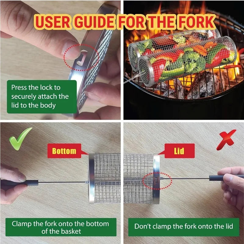 Versatile Uses:Grill basket cylinder, Can be used to cook a variety of foods: vegetables, fish, chips, meat, burgers, steaks, fish, shrimp, onions, pizza and more. Roller grilling basket Compatible Includes foods that other grills cannot bake such as:asparagus, beans, spinach, kale, Brussels sprouts, chips, meatballs, salmon and peaches and even desserts