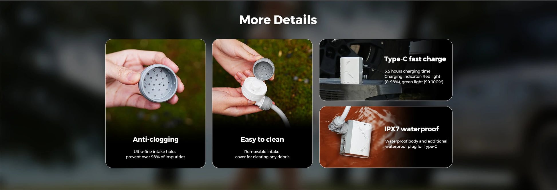 Package Contents: TINY SHOWER x 1, Type-C Cable x 1, User Manual x 1, Airtight Rings