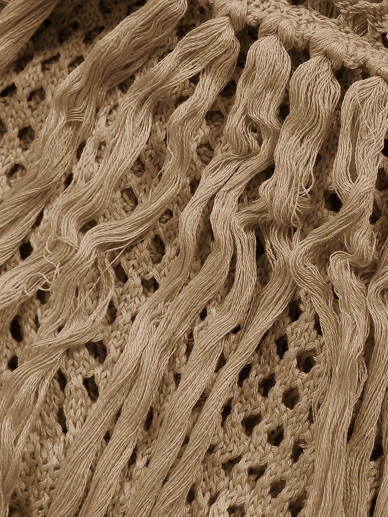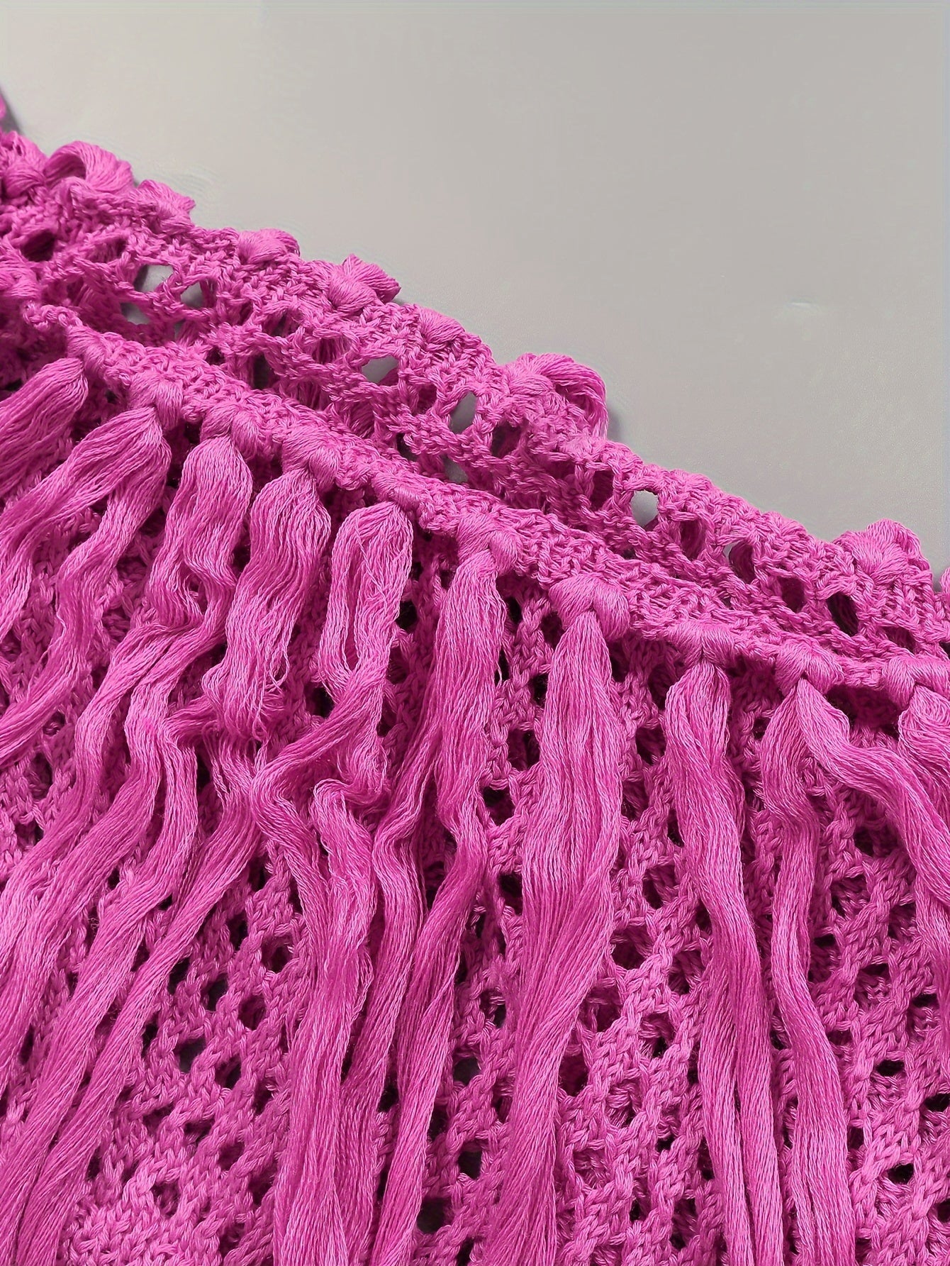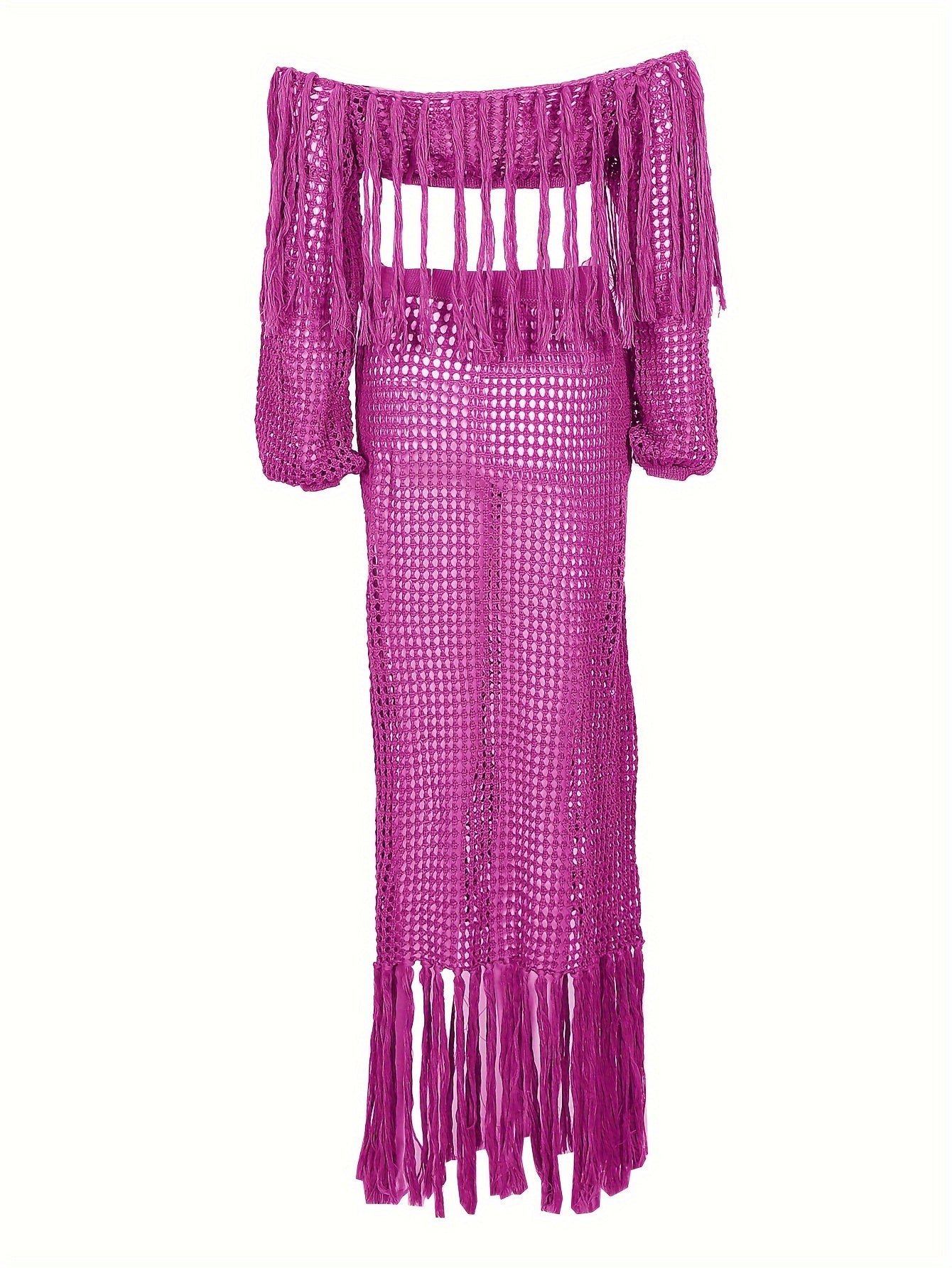 Long Sleeve Off-Shoulder Crop Top & High Waist Split Hem Skirt Set - Elegant Vacation Outfit with Tassel Details, Semi-Sheer Knit Fabric, and Crochet Fringe Hem - Polyester Womens Clothing for Summer