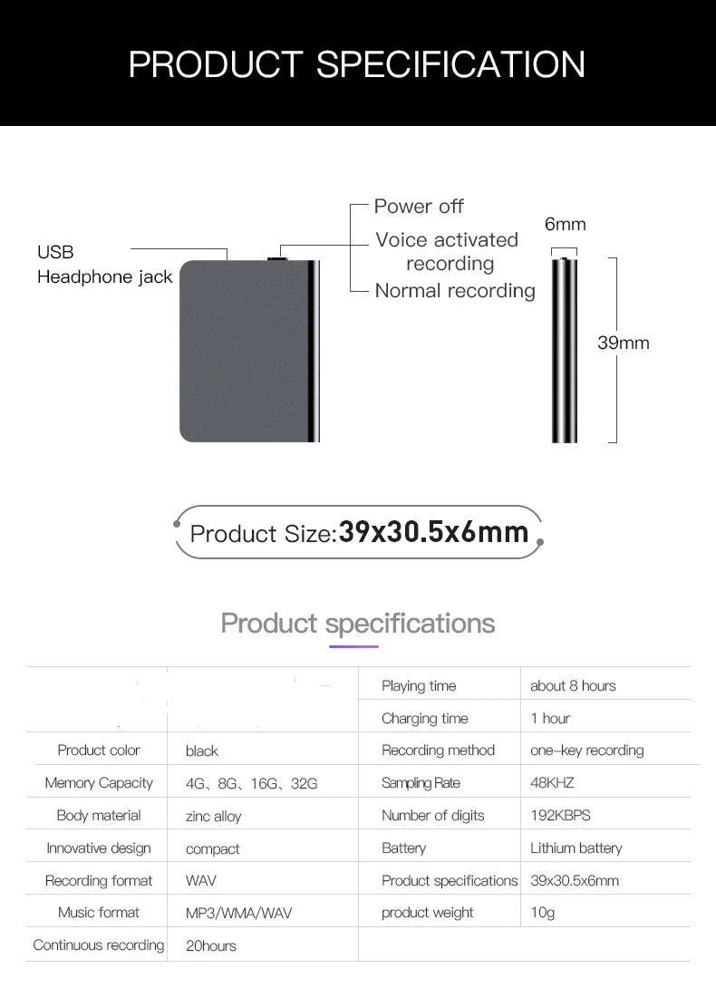 Small Voice Record Activated Mini Digital Voice Recorder Espia Micro Sound Dictaphone Secret Audio Recorder 8/16/32GB MP3 Player